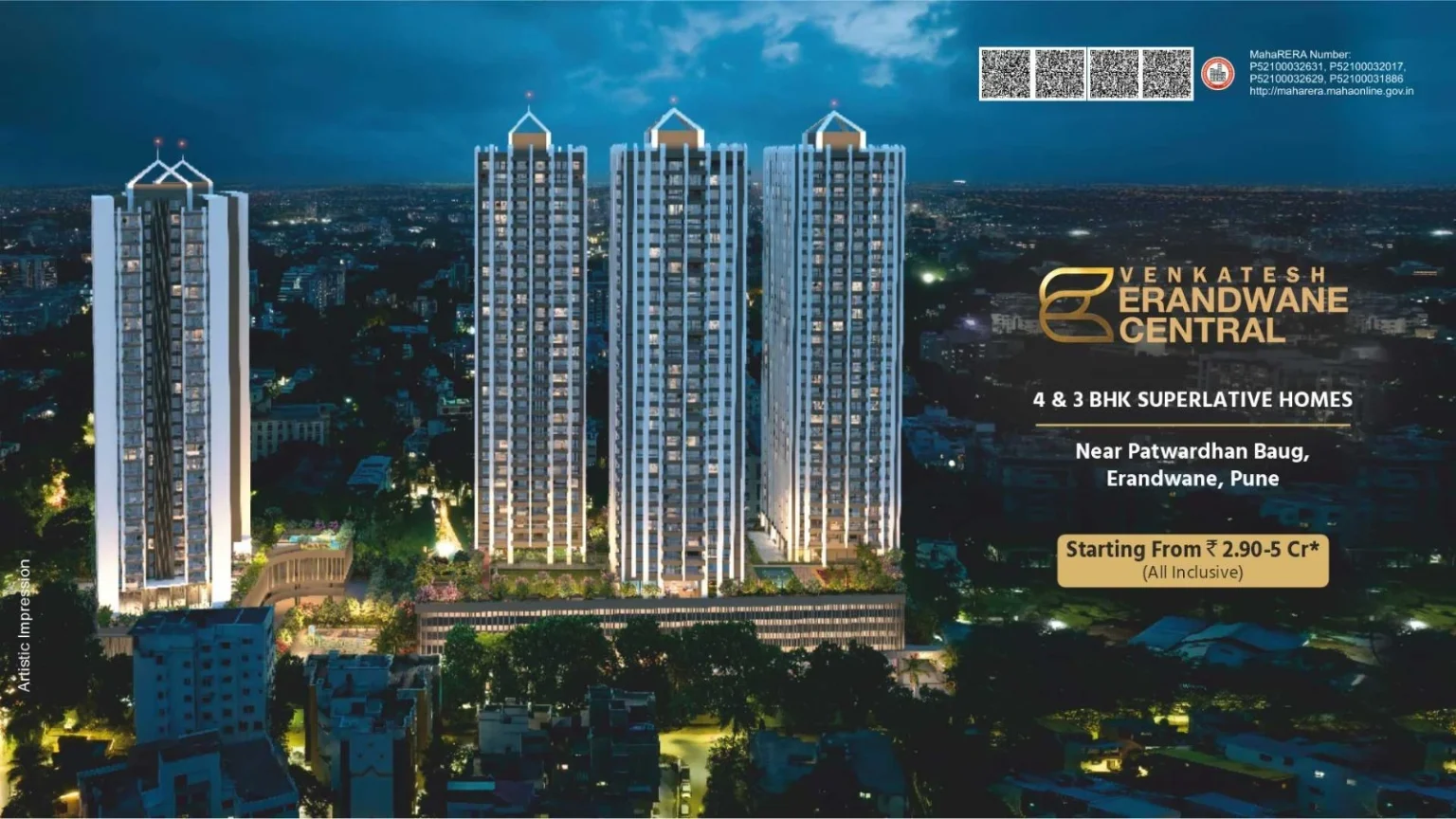 Venkatesh Erandwane Central Erandwane, Pune The ideal place to be is in someone’s heart, so why not make your home in the heart of your city? Venkatesh Buildcon is excited to introduce a remarkable project located at the CDSS Compound in the center of Pune – Venkatesh Erandwane Central. This development offers exceptional homes with stunning city views, excellent road access, and over 25 fantastic amenities. Experience a luxurious lifestyle like never before on 4.5 acres of excellence and grandeur. This exclusive mega project at a prime location is set to redefine Pune 4.